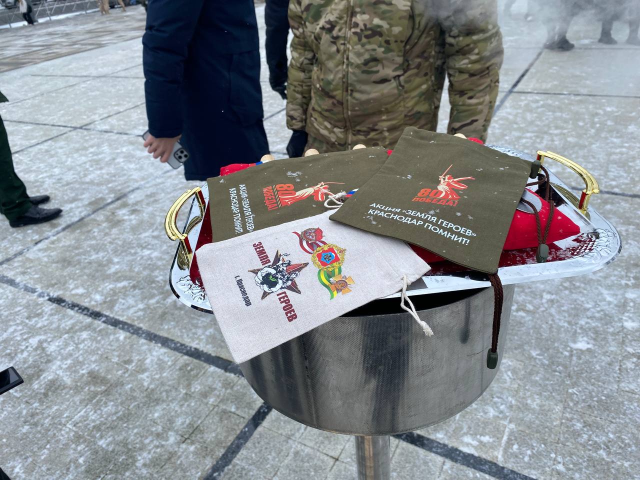 В рамках акции собрали землю с кубанских мест захоронений солдат, погибших на фронтах Великой отечественной войны. Её поместили в солдатские кисеты. Их торжественно вручили участникам СВО. Землю привезут в Ростов-на-Дону на территорию собора Георгия Победоносца. Это Главный православный воинский храм Южного военного округа.